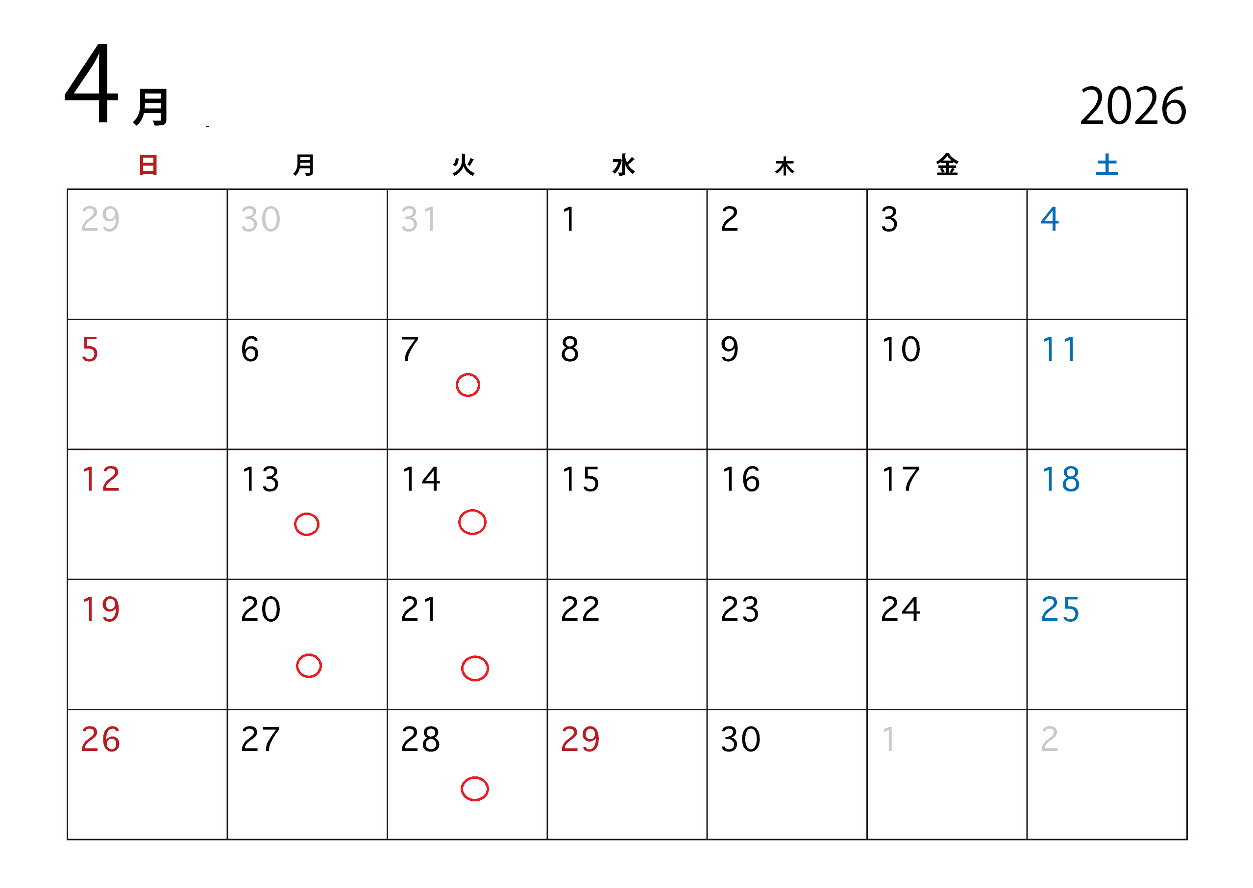7日(火)、13日(月)、14日(火)、20日(月)、21日(火)、28日(火)です。